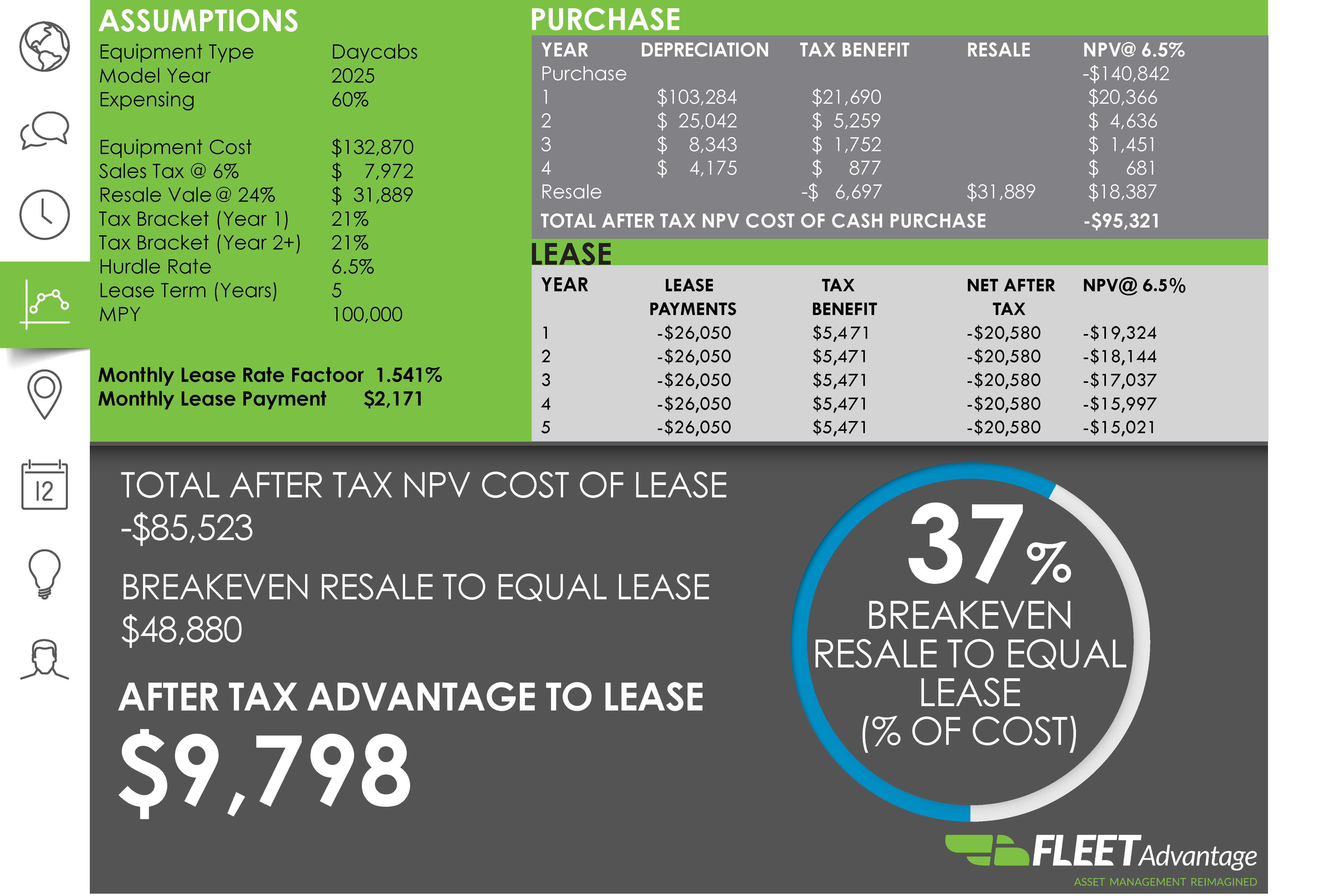It is evident by the cash flow in this lease vs purchase analysis that there is an after-tax advantage to lease a tractor. The example presented is for a model year 2025 Daycab on a 5-year term costing $132,870. The model assumes 60% bonus depreciation, a resale value of 24% at the end of 5 years, a state sales tax of 6%, a 21% federal tax rate, a lease rate factor of 1.541%, and a discount rate of 6.5%. The discount rate is a function of the current market forces. The total cost associated with purchasing an asset includes the upfront cost of the equipment, depreciation expense, tax expense, and the resale of the asset at the end of its useful life resulting in a net present value of $95,321. The total cash outflow associated with leasing an asset are the fixed annual costs in the form of lease payments including state sales tax resulting in a net present value of $85,523. Lease is favored by $9,798.