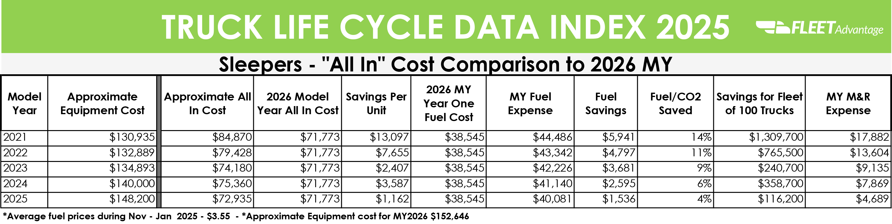 FORT LAUDERDALE – (February 27, 2025) – Fleet Advantage, a leading innovator in specialty financing, fleet data analytics, fleet management services, and life cycle cost management, today released its latest Truck Life Cycle Data Index (TLDI), which compares all-in operating costs of Class-8 vehicles. The TLDI shows significant cost savings when replacing older-model vehicles with 2026 MY trucks.